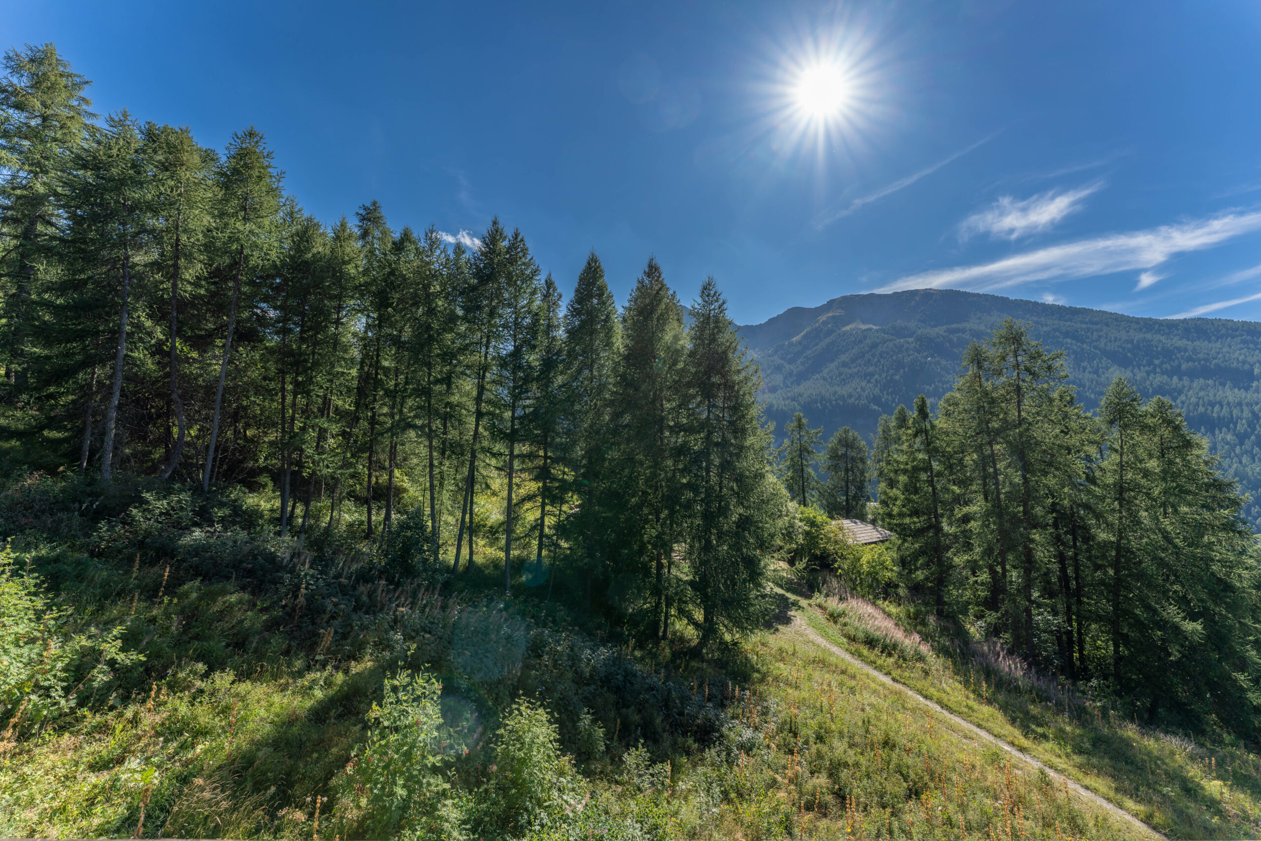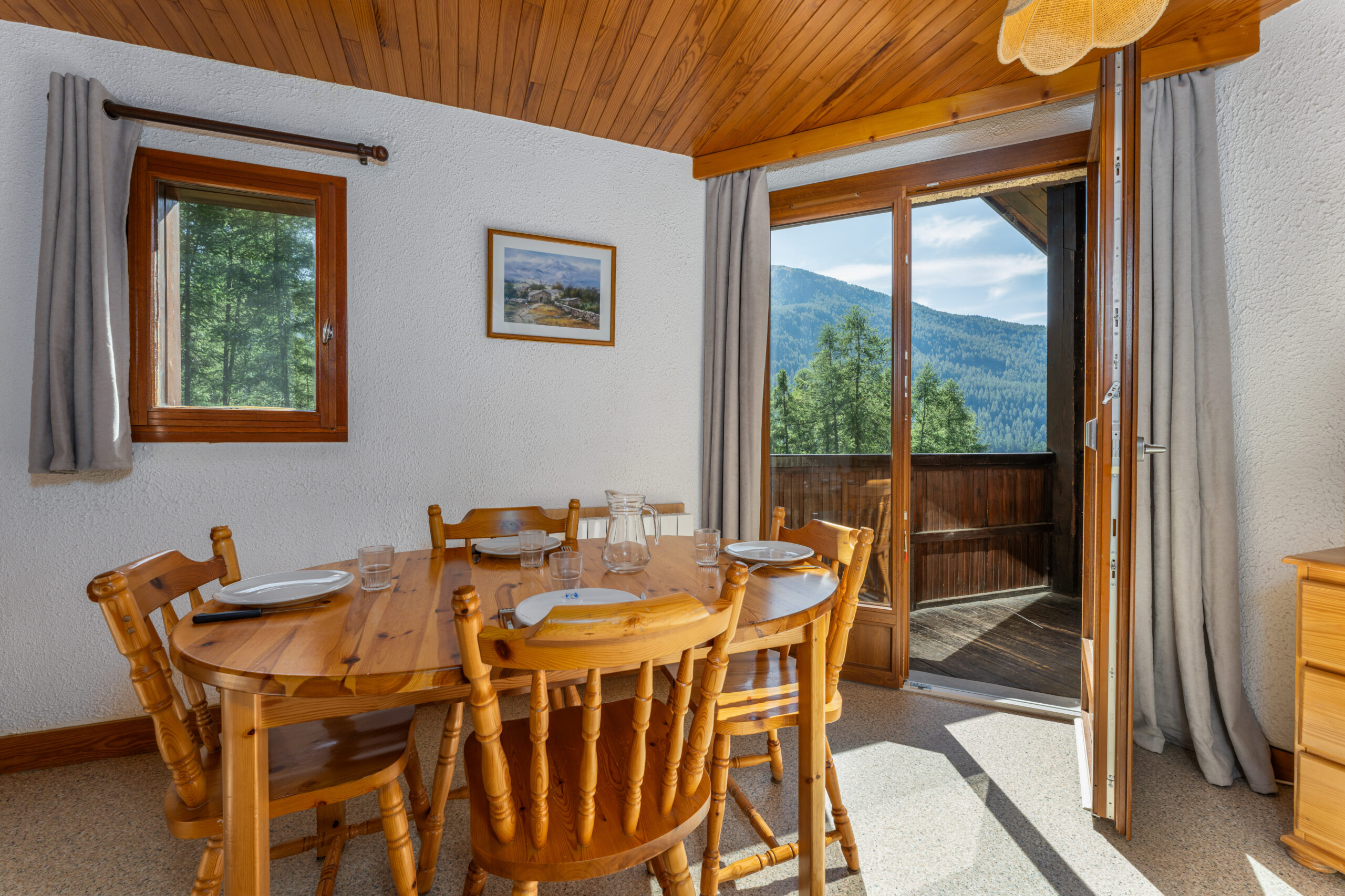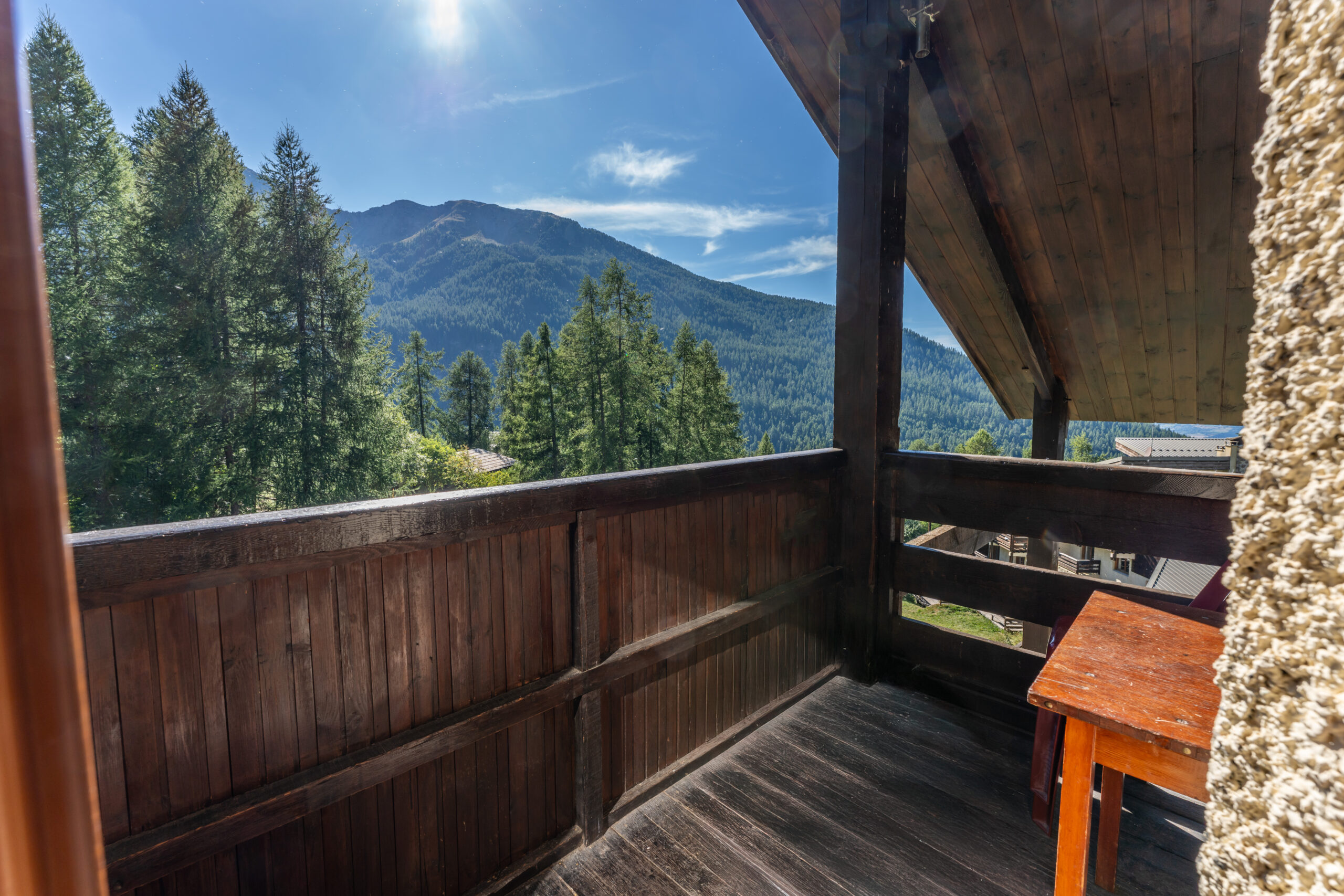 Décoration intérieure en bois, orientation sud avec balcon, vue sur les montagnes et le jardin du chalet.