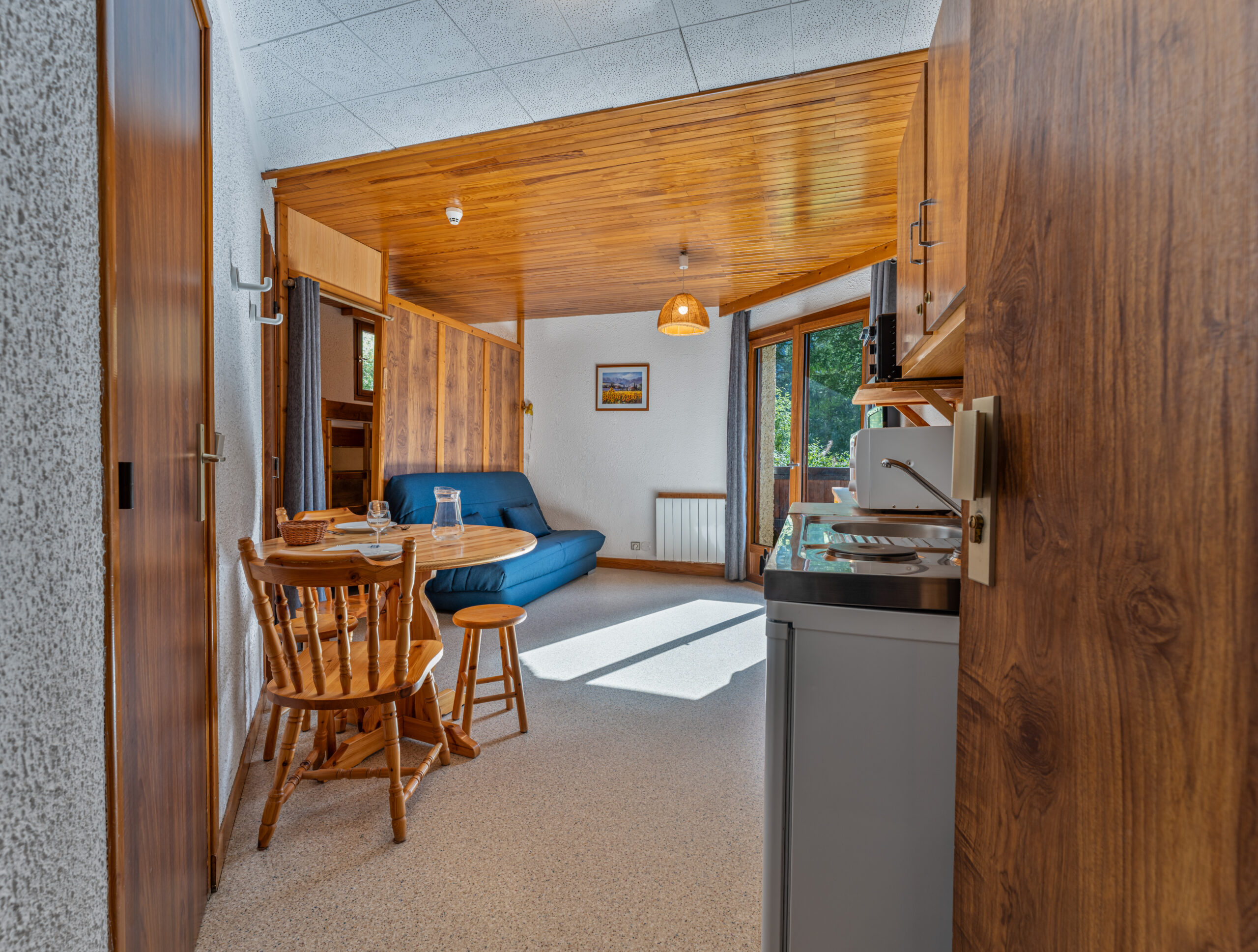La pièce principale est meublée d’un canapé clic-clac 2 places et équipé d’un coin cuisine ; Le « coin montagne » avec lits superposés est séparé par une petite cloison en bois.